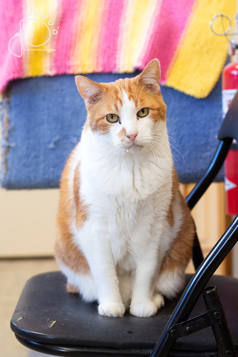 Marble came to us because his owner had passed away and the family was not able to care for him. Marble is a grand old sole, a big friendly orange tabby looking for attention and love. He loves petting and attention and will follow you around all day long monitoring your duties and what is happening, but he has a limit and lets you know when he has had enough loving for now. Although Marble does like attention and petting, he has shown us that he prefers petting on the head and neck area but would rather you not go any further. Unfortunately Marble does get a lot of mats in his coat but doesn't like to be brushed. To keep on top of the mats requires much patience and daily vigilance.