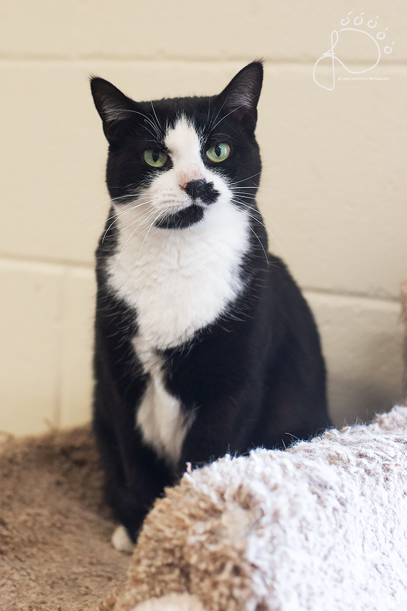 Oreo plays well with other cats in the facility and generally gets along with everyone. She is happy and playful, often initiating a game of tag with one of the other cats. Laps are a favorite napping place if you are able to sit for a while and her purring is automatic!!